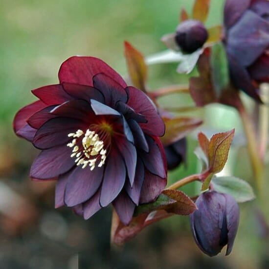 Морозник Дабл Эллен Пурпл – удивительный травянистый многолетник с мощным корневищем, пальчатыми кожистыми листьями и совершенно очаровательными цветками. У них нежные, будто вырезанные из тонкого пергамента, глянцевые лепестки темно-фиолетового цвета и золотисто-желтые тычинки.