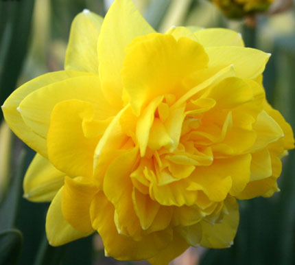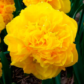 Потрясающий среднецветущий гибрид входит в группу Махровые нарциссы. В высоту он достигает до 35 см, а в ширину – 10 – 20 см. Листья глубокой сине-зеленой окраски. Цветки образуются махровые, крупного размера. Они имеют двойное количество лепестков и золотистую гофрированную коронку. Доли околоцветника широкие, окрашенные в насыщенный лимонно-желтый оттенок, с закругленными концами. Цветки размещены горизонтально и источают сладкий аромат. На одном цветоносе образуется по 3 – 4 эффектных бутончика.