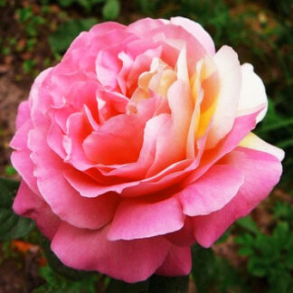 Куст вырастает не слишком большим. В высоту он достигает 1 – 1,2 м. Побеги ровные и прямые, хорошо удерживающие вес распустившихся соцветий. Бутоны аккуратной бокаловидной формы, махровые (состоят из 40 лепестков). Окрас цветка цикломеново-розовый, с белыми штрихами. Диаметр – около 10 см. Весь период цветения многолетник сохраняет отменные декоративные качества. Роза источает приятный и ненавязчивый аромат.